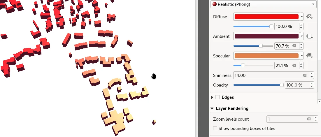 The Phong shader is used as the default material for showing vector features in QGIS 3D views. For 3.36, this shader has been improved to better handle ambient and shininess parameters. Additionally, we’ve taken care to ensure that the exact same shading will apply regardless of the underlying geometry type (points, lines or polygons), and regardless of whether data defined symbol colors are in use. This gives users a much more predictable and easy-to-configure material for their 3D views.