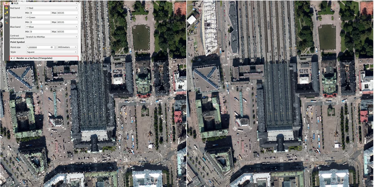 We’ve added a new option for 2D styling of Point Clouds that for “Render as a Surface (Triangulate)”.