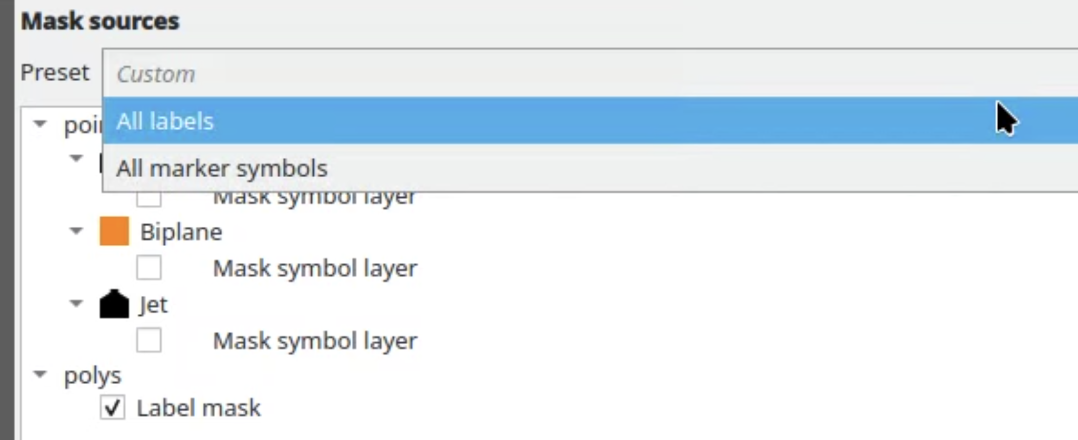 Users can now use a drop-down under Mask Sources when configuring a layer’s masking and select from a number of presets to efficiently apply masking without complex management. This is especially useful for large projects when many different layers need to reference the same complex set of mask sources, such when many layers are masked by the same set of distinct labeled layers.