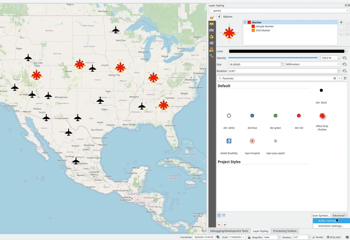 QGIS now includes “buffers” for marker symbols. Just like label buffers, marker buffers are a halo effect around marker symbols designed to make the symbol more readable against different backgrounds.
