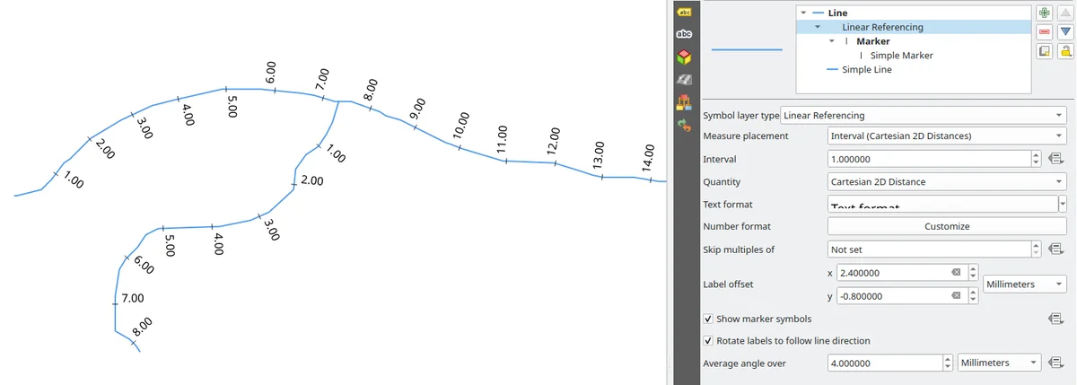• An optional “skip multiples of” setting. If set, then labels which are a multiple of this value will be skipped over. This allows construction of complex referencing labels, eg where a symbol has two linear referencing symbol layers, one set to label every 100m in a small font, skipping multiples of 1000, and a second set to label every 1000m in a big bold font